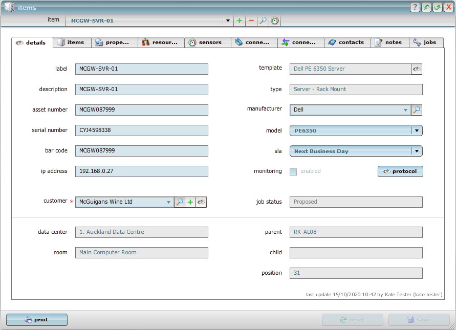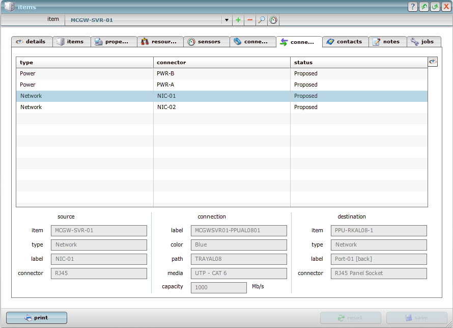 Easily trace connections for network or power using our connections tab.  Examine the connection source and trace the connection to its termination at the patch frame, UPS or further.  Add details of the connection including cable label, colour and media used.