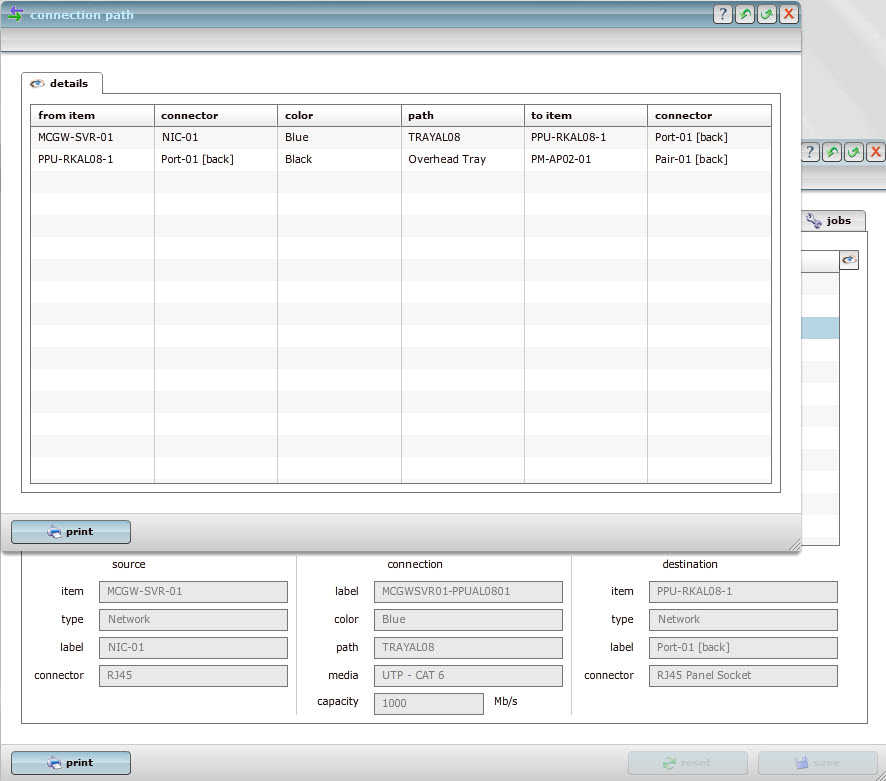 Specify circuit details for each connector, including circuit id, carrier and the customer associated with that circuit.  View and print the connection path so it can be handed to the cabling installer or for fault tracing purposes.
