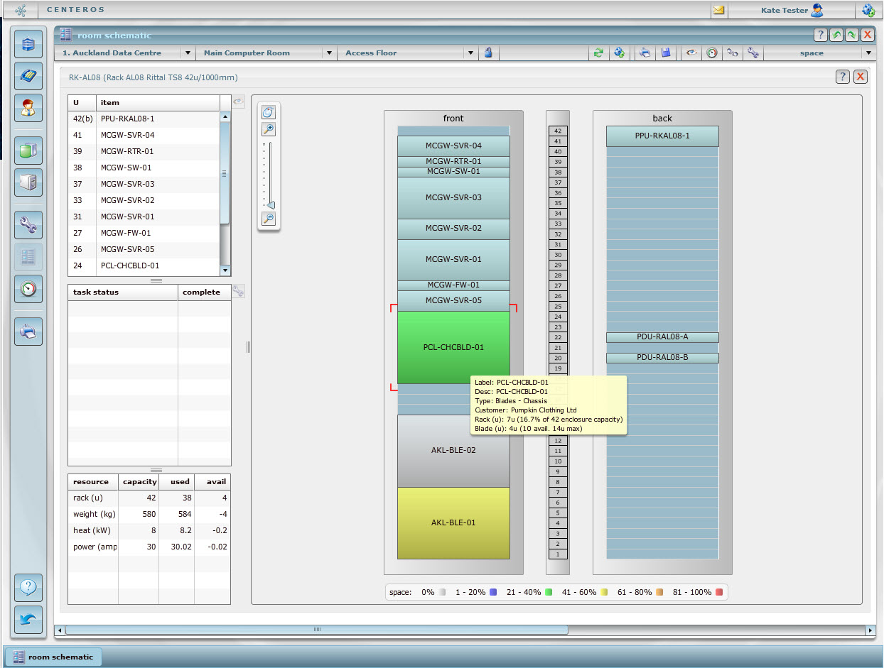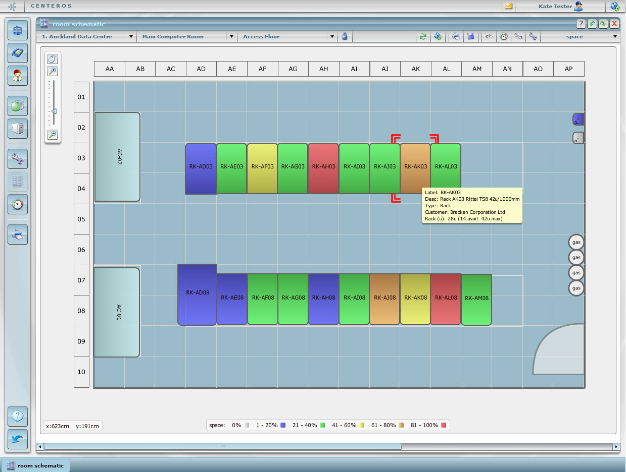 CENTEROS was built to make managing Space, Power and Cooling easy. Scale floor plans of each data center room show the position of equipment and the availability of space.