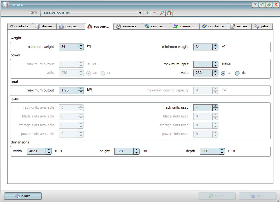 Different filters can be used in the room schematic view to display colors for heat load, weight and connections. Each piece of equipment contributes to these overall values and can be changed. The resources tab allows you to edit the details including the weight, power, heat, space and dimensions of the asset.