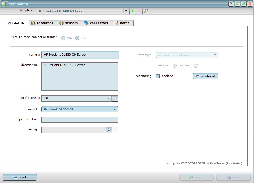 Our template library stores the resource information for common equipment. These templates can be used to quickly create instances of real equipment that are installed in your data centre. These Templates remove the requirement to repeatedly look up, interpret and key information for vendor specifications.
